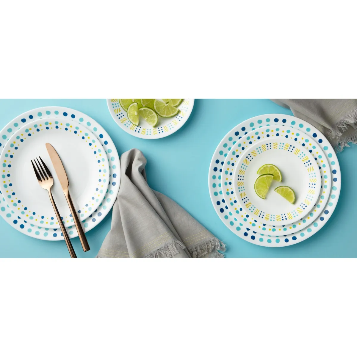 דגם קי ווסט בגווני קיץ טרופים שובים, משלב נקודות אמורפיות בגווני צהוב וכחול, על רקע לבן נקי. הסט הופך כל שימוש יומיומי לחגיגה של ממש.