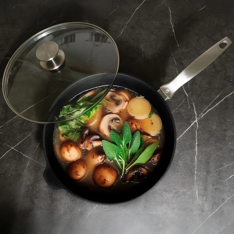 צריבה, בישול איטי ואידוי - הכל בכלי אחד! הסוטאז' מסדרת CXD הוא כלי רב-תכליתי חיוני המעוצב להעניק ביצועים של מטבח מקצועי. עם דפנות עמוקות ושטח פנים רחב, הוא מושלם להכנת רטבים, תבשילי קדירה וארוחות 'סיר אחד' משפחתיות. הציפוי הקרמי הדו-שכבתי המחוזק ביהלומים מבטיח שהמזון לא יידבק, בעוד גוף האלומיניום העבה מבטיח פיזור חום מהיר ומניעת נקודות חמות. הסוטאז' כולל מכסה זכוכית איכותי המאפשר מעקב אחר הבישול וידיות פלדת אל-חלד ארגונומיות למעבר בטוח מהכיריים לתנור. גם מוצר זה נקי לחלוטין מכימיקלים ממשפחת הPFAS ואינה מכילה PFOA , PTFE, עופרת, קדמיום או כספית